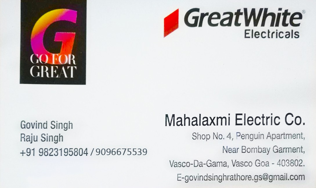 Mahalaxmi Electrical Wholesale Supplier in Vasco, is an authorized distributor of Greatwhite Electricals. We are committed to excellence in all our products, whether they are electrical wiring devices (EWD), wires and cables, circuit protection systems (MCB/RCCCB), lighting and fixtures, or switches and accessories.